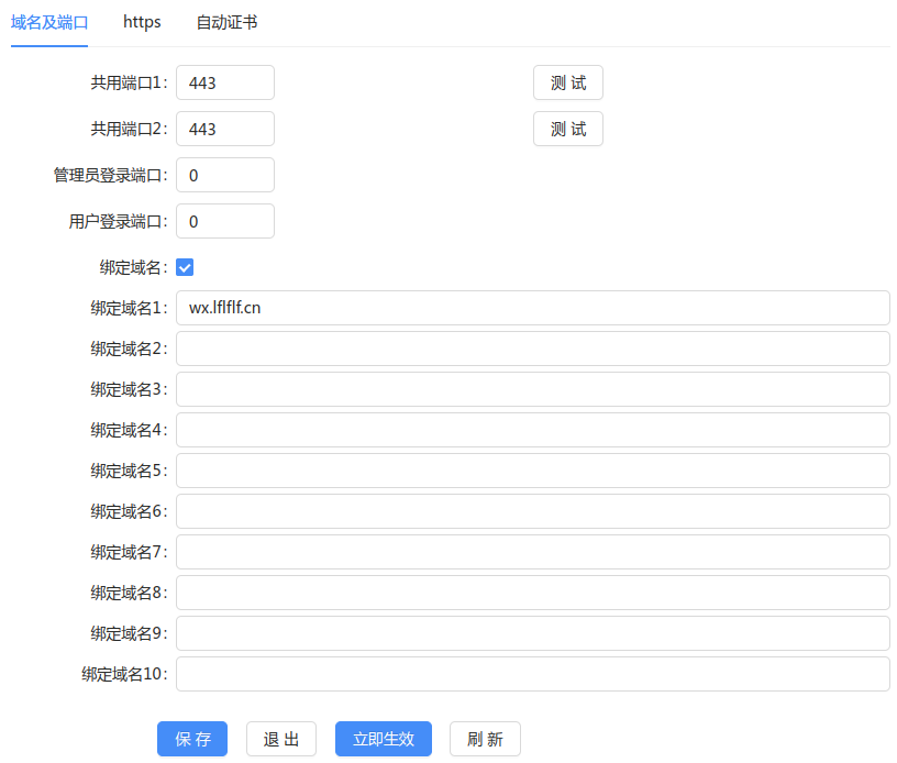 可自动续期的证书不能占用80口,这个端口需要用来申请证书用,同时需要绑定域名里面至少填一个(可以不勾上绑定域名但要填下面的绑定域名1)。
