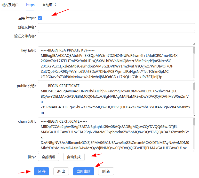 开启https,第一次没有私钥和公钥,点击自动生成,保存,立即生效。