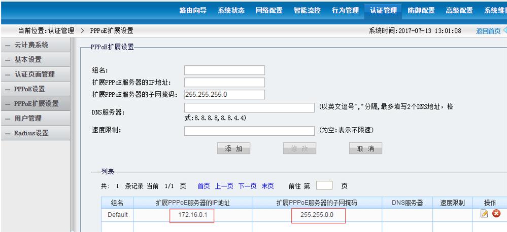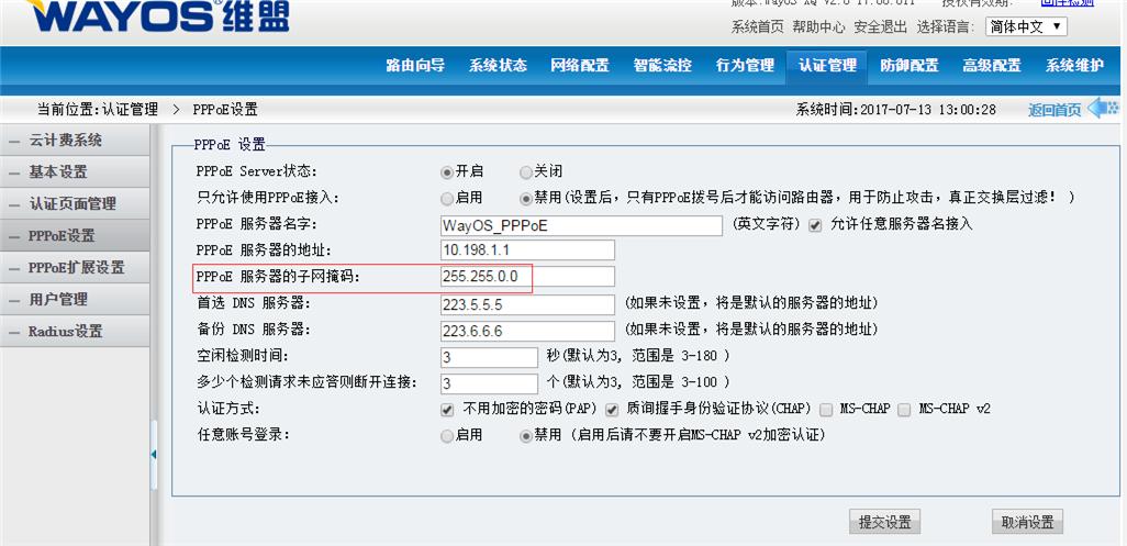 请注意维盟这个扩展子网的换算,如果用255.255.0.0的话,扩展PPPoE的服务器IP地址只能用0.1结尾。