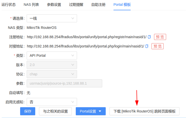 全局设置,NAS管理,NAS类型要选择好并保存,Portal模板里面就有提示可以下载这个文件了。