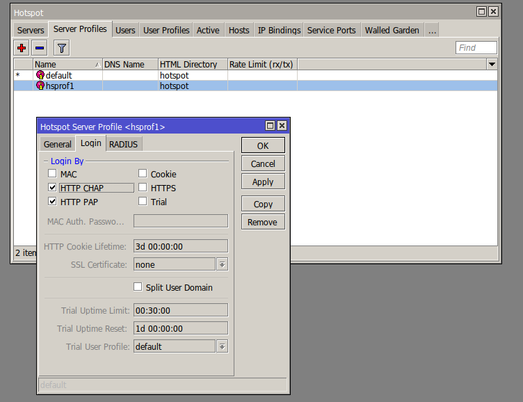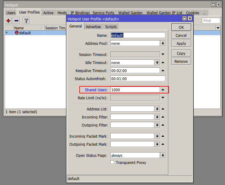 默认情况下,ROS只允许用户上线1次,这个Shared Users比计费的共享数优先级高,如果您没有打算让单个用户上线多次,也可以不动这个设置。