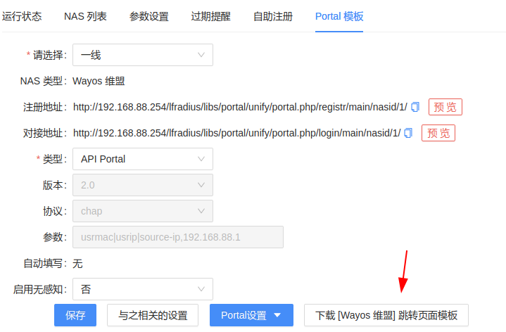 全局设置,NAS管理,NAS类型要选择好并保存,Portal模板里面就有提示可以下载这个文件了。