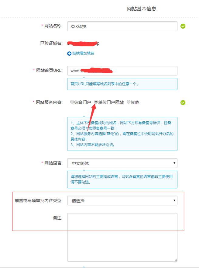网站语言就简体中文就好,前置或专项审批类型千万别选,备注留空,之前我们讲说,只有前面有*号的才填。