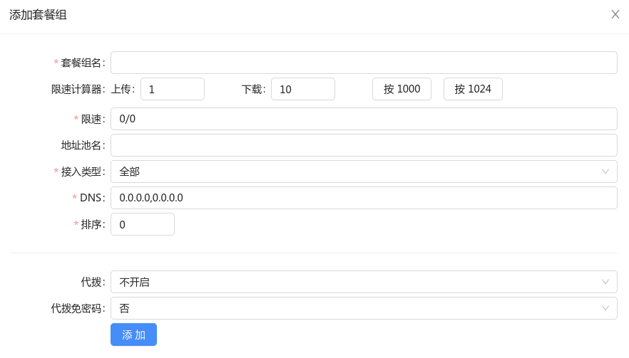 地址池名:套餐绑地址池名,部分路由支持地址池名功能,这样可以把如电信的用户拔号归类到电信,联通的归类到联通,要注意大小写不要用中文。